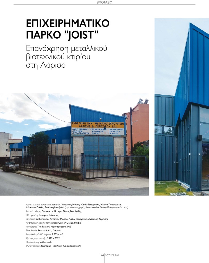 τοτεύχος τους Ιουνίου του τεχνικού περιοδικού Κτίριο αφιέρωσε 8 σελίδες στην έντυπη έκδοση του στην κάλυψη του Joist, του Project που μελετήσαμε, επιβλέψαμε και κατασκευάσαμε για iED στη Λάρισα. Είμαστε πολύ χαρούμενοι που βρήκαμε αυτό το βήμα για να εκφράσουμε τη στρατηγική μας στην προσαρμοστική επανάχρηση του κτηρίου.
