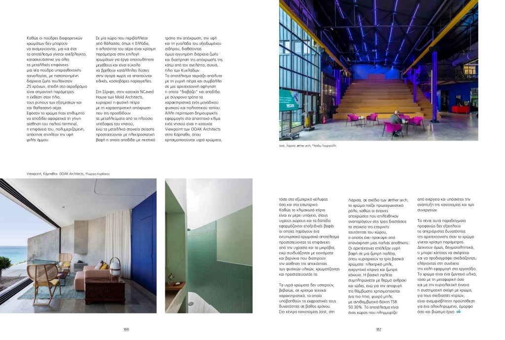 Το Joist συμπεριλαμβάνεται σε ένα άρθρο στο περιοδικό ek | architecture plus design, τεύχος 287, Μάιος 2024. Συντάκτης του άρθρου ειναι ο αρχιτέκτονας Σταύρος Μαρτίνος ο οποίος εμβαθύνει στην πρόσφατη τάση της χρήσης του χρώματος στη σύγχρονη Ελληνική αρχιτεκτονική.