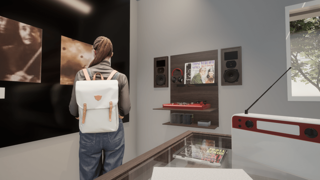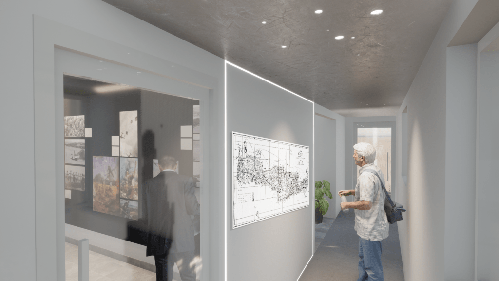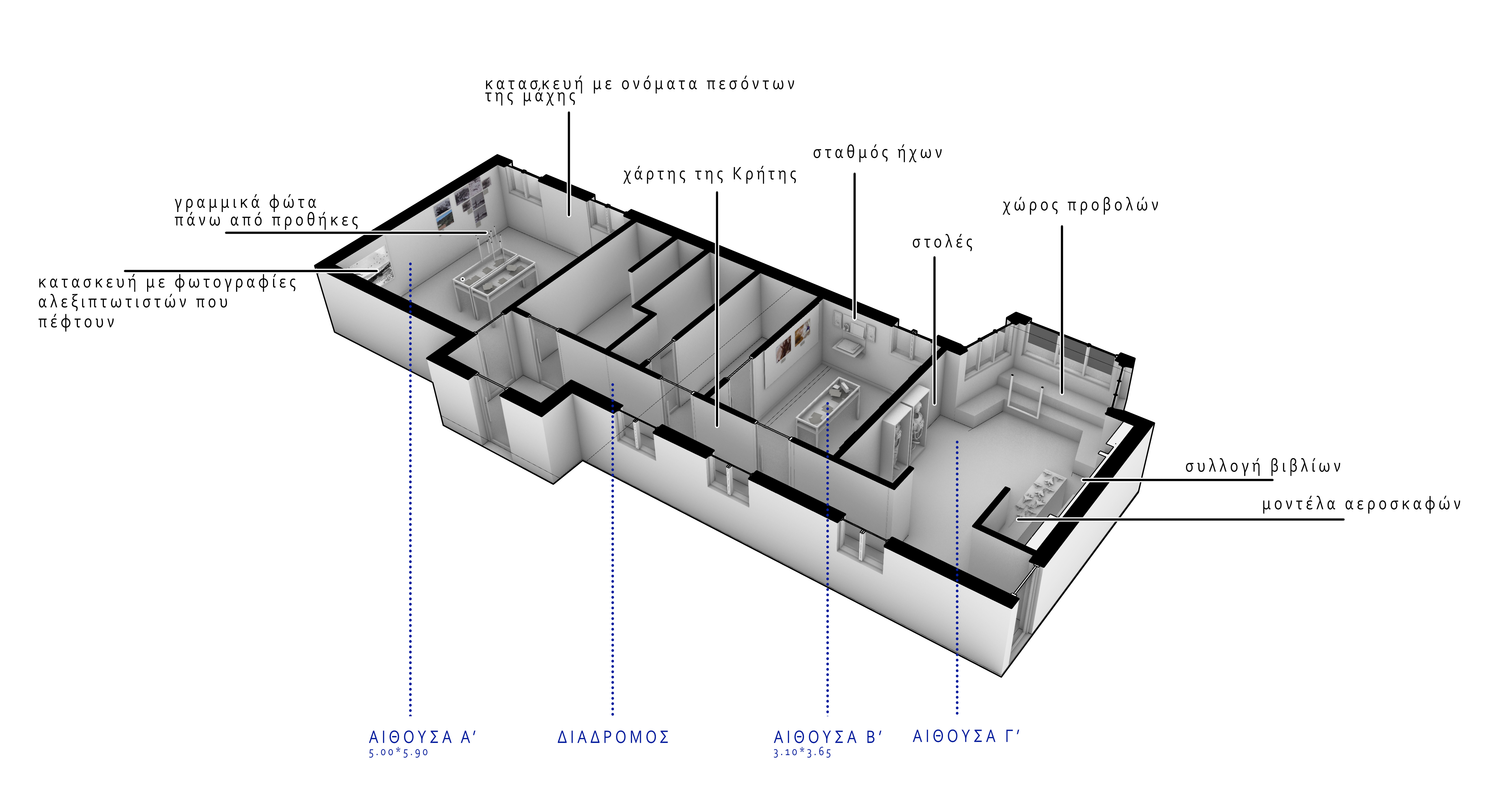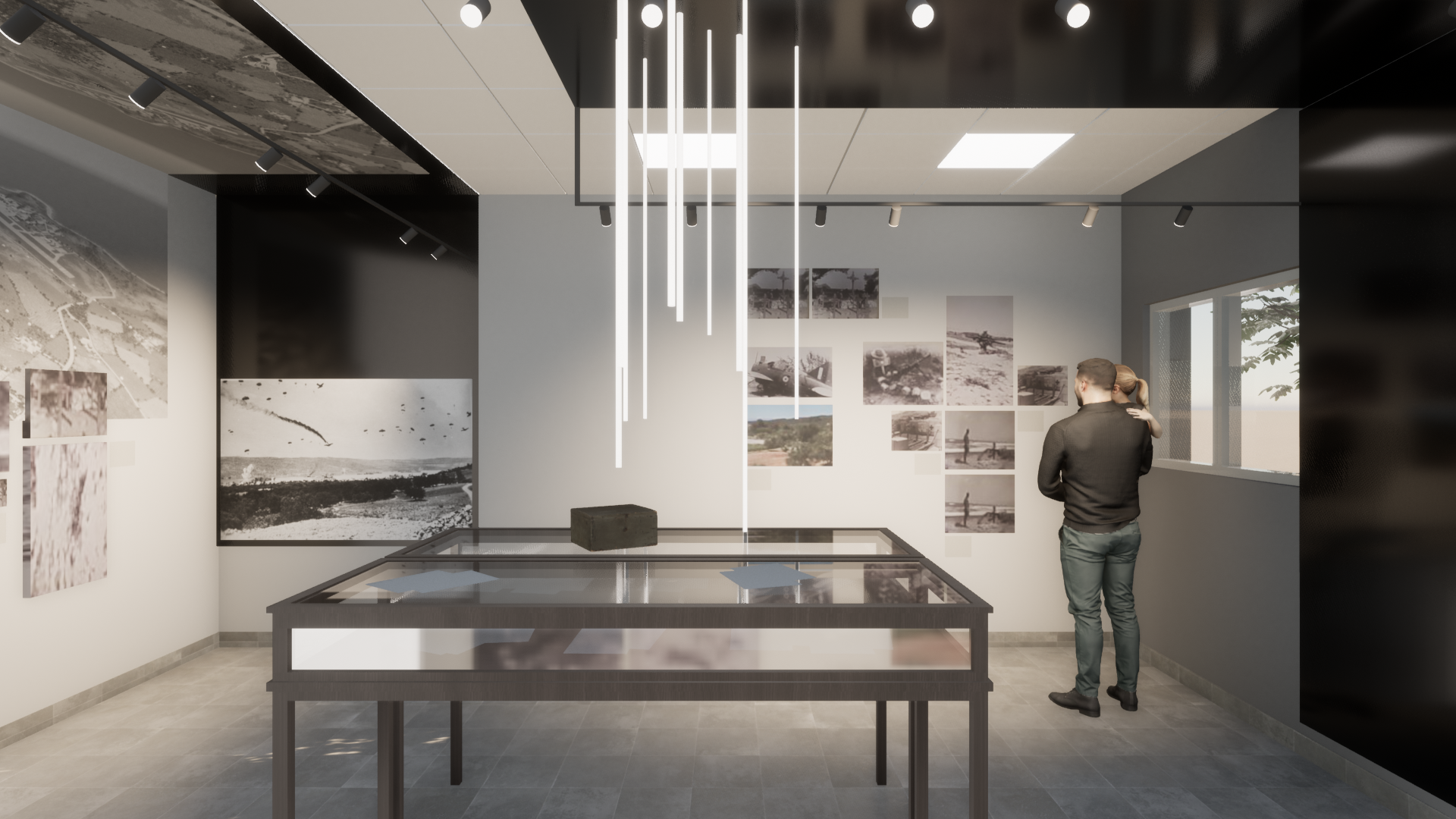 Αρχιτεκτονικά προτείνεται η παρουσίαση των πιο ευαίσθητων εκθεματων μέσα σε δύο υπάρχουσες προθήκες στο κεντρο της αιθουσας, πάνω από τις οποίες θα κρεμονται γραμμικά φώτα που αναφέρονται στην κατακόρυφη κίνηση αλεξιπτωτιστών που πέφτουν από τον ουρανό. Περιμετρικά στους τοίχους τοποθετούνται φωτογραφίες και λοιπά εκθέματα σε μικρότερες υπο-ενότητες που πιθανόν να προκύψουν μετά την αξιολόγηση και καταγραφή του πλήθους του υλικού. Δύο κατασκευές από ξύλο όμοιο των προθηκών επενδύουν τους τοίχους της αίθουσας σε σχήμα που γλείφει τον τοίχο και καταλήγει να καλύψει τμήμα της οροφής. Στο κομμάτι που δημιουργεί το ‘ταβάνι’ της κατασκευής ανοίγονται οπές, όμοιες με τα σχήματα αλεξιπτωτιστών που ‘θα πέσουν’, ενώ φωτίζουν σαν έναστρος ουρανός
