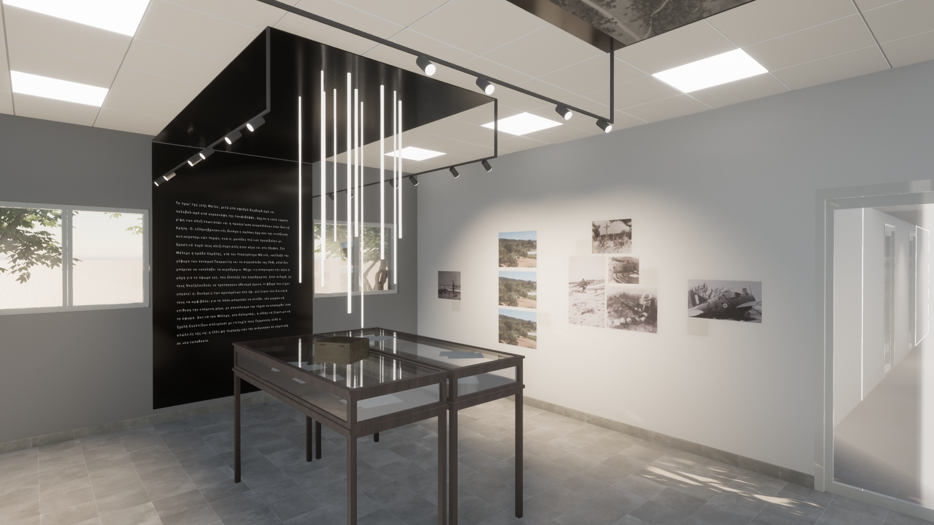 Στο χώρο του διαδρόμου έξω από τις τρεις αίθουσες προτείνεται μία ήπια διαμόρφωση της οροφής του διαδρόμου με διάτρητα φωτιζόμενα φύλλα μετάλλου και γραμμικά στοιχεία φωτισμού, ενώ ο σκοπός της υβριδικής αυτής ενότητας βρίσκεται στο να προετοιμάσει συναισθηματικά και νοητικά τον επισκέπτη και να τον τοποθετήσει στο χωροχρόνο των γεγονότων, εκθέτοντας μόνο ένα μεγάλο χάρτη της Κρήτης στα μέσα του 20ου αιώνα με επισημασμένα τα σημεία των σημαντικών μαχών της εποχής