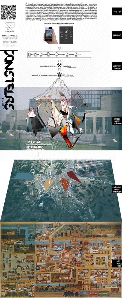To ConstLRS είναι ένα phygital επαυξημένο θραυσματικο αντικείμενο που χωροθετείται στον περιβάλλοντα χώρο της πινακοθήκης Κατσίγρα, στη Λάρισα. διαβάζει τα διάσπαρτα θραύσματα της Πολιτείας του Αστεριάδη στο φυσικό χώρο της πόλης της Λάρισας. Μέσω εφαρμογής augmented reality αντιπαραβάλει την πληροφορία που υπάρχει με το φυσικό της χώρο. Η πληροφορία που αντιπαραβάλεται είναι τα έργα της συλλογής με το φυσικό χώρο της πόλης και τα ιστορικά γεγονότα που αποτέλεσαν την έμπνευση για αυτά. Οι χρήστες της εφαρμογής μπορούν να εμπλουτίζουν με περιεχόμενο την database της εφαρμογής. Το περιεχόμενο μπορεί να είναι από τη χρήση της κάμερας ή του πληκτρολογίου (κείμενο). Η πληροφορία μπορεί να αξιολογείται για τη σχετικότητα της και από άλλους χρήστες ενω γινεται και datamining που στέλνει μέσω hastags# την πληροφορία στο Installation στην πινακοθήκη Κατσιγρα. Η εγκατάσταση στην πινακοθήκη αποτελείται από παραγωνες οθόνες που αναφέρονται μορφολογικά στα διαμερίσματα της πόλης της Λάρισας όπως αυτή συγκροτείται στο mind map που είναι ο πίνακας «Η Πολιτεία» του Αγήνορα Αστεριαδη. Το έργο συνυπάρχει με την phygital installation που το κάνει reference και το οποίο στηρίζεται στην πληροφορία που συλλέγουν τα θραύσματα του site specifically από την πόλη της Λάρισας ανασυγκροτώντας της φαντασιακά μέσα από τα Αστεριαδικά (CostLRS) της θραύσματα