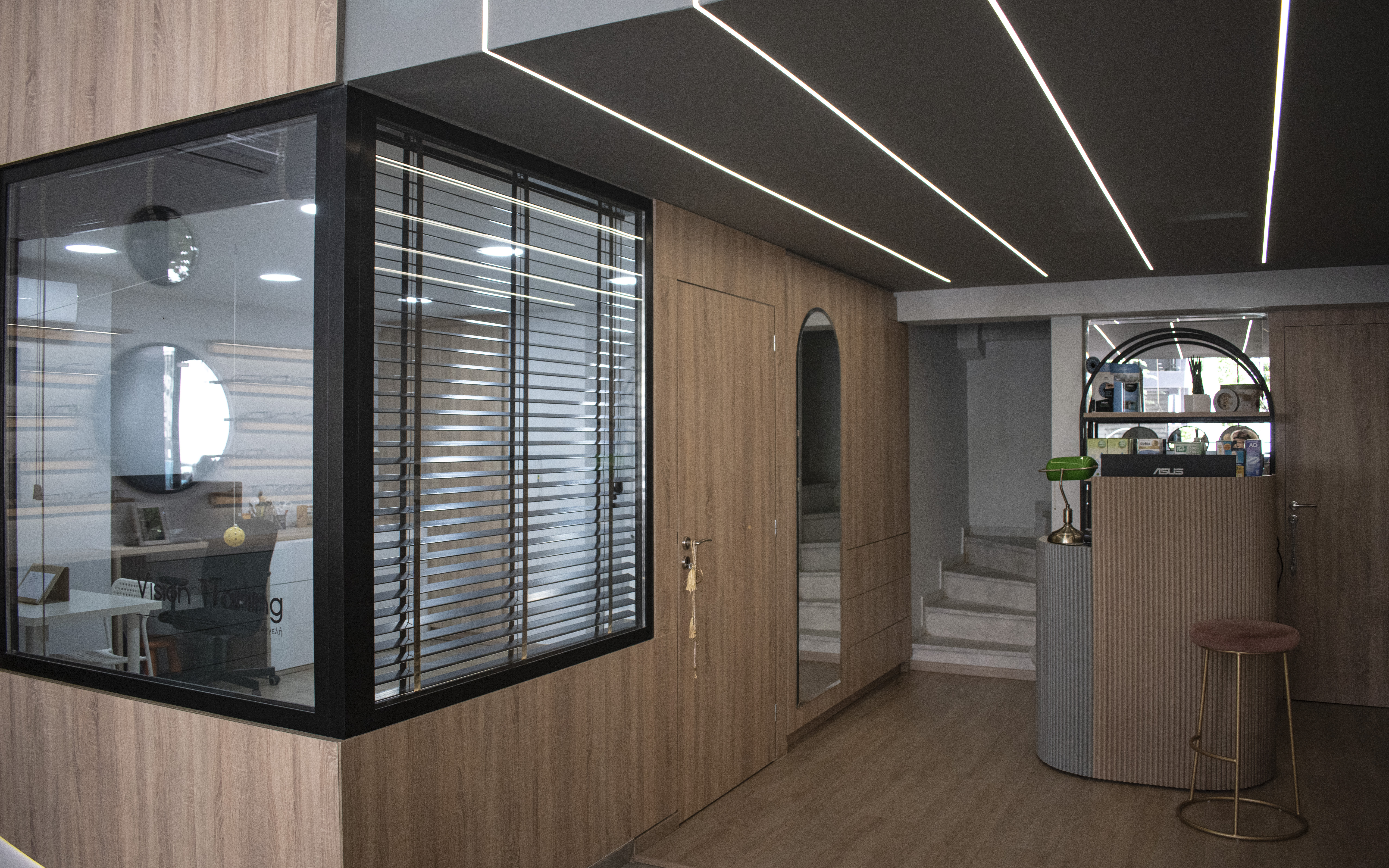 «OptoTherapy» is a specialized store in optics and vision training. It is located in the centre of Larissa. We were asked to do lots of custom work so that there would be no spare space in the otherwise tight plot. We did the lighting design too. Materialy we incorporated lots of wood in order to create contrast for the glasses.