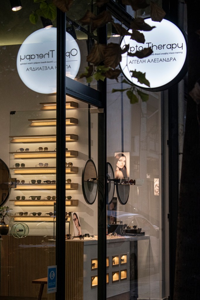 Το «OptoTherapy» βρίσκεται στο κέντρο της Λάρισας και επιχειρεί τον συνδυασμό εμπορικού χώρου με ιδιαίτερα brands οπτικών, φακών, αναλώσιμων, και χώρου παροχής εξειδικευμένων υπηρεσιών εξάσκησης όρασης (vision training). Αυτά τα στοιχεία καλείται να αναδείξει ο σχεδιασμός, παρέχοντας από τη μία πλευρά έναν χώρο εξωστρεφή, σαφή, άνετο και χωρίς οπτικά εμπόδια (εμπορικό τμήμα) ενώ από την άλλη προσδιορίστηκαν ποιότητες που εξασφαλίζουν την ιδιωτικότητα, την ηρεμία και τις προδιαγραφές για το vision training. Το γεγονός ότι το vision training απευθύνεται κυρίως σε παιδιά και νεαρούς ανθρώπους απαιτούσε ειδικούς χειρισμούς τόσο σε σχέση με την επιλογή των υλικών αλλά και τις προδιαγραφές ανάγνωσης του χώρου.