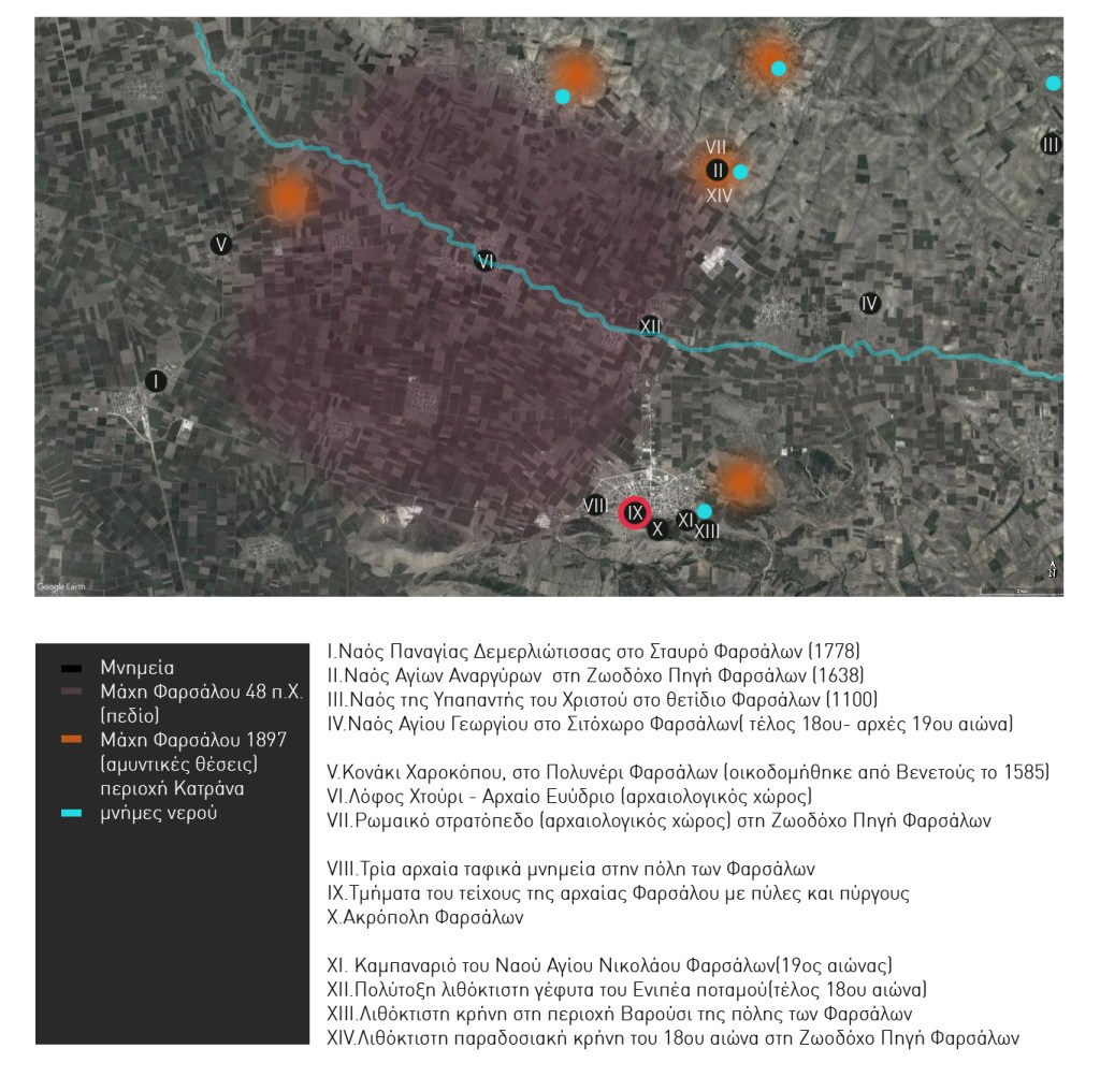 Η χρονολόγηση των νέων αυτών τειχών δεν είναι επαρκής ωστόσο επιβεβαιώνουν τη στρατηγική σημασία της πόλης (σε συνδυασμό με τα τις εγκαταστάσεις στην ακρόπολη των Φαρσάλων και τα νεότερα πολυβολεία) και την πρωτοκαθεδρία που είχε στην περιοχή. Ακόμη και στην τωρινή κατάσταση της πόλης, με τα κτίρια να είναι ψηλότερα, η περιοχή Κατράνα διαθέτει εξαιρετική θέα τόσο στην πόλη όσο και στον κάμπο και έτσι θεωρήσαμε ότι συνοδευτικά στις πολιτιστικές λειτουργίες θα μπορούσε να προστεθεί και αυτή του παρατηρητηρίου. Το παρατηρητήριο θα μπορούσε να δίνει πληροφορίες για την ευρύτερη περιοχή για πολιτιστικά και κοινωνικά ή ιστορικά στοιχεία όχι παραθέτοντας την πληροφορία όπως σε ένα κείμενο αλλά υποδεικνύοντας το σημείο στο οποίο έλαβαν ή λαμβάνουν χώρα. Με αυτό τον τρόπο το σημείο της θέασης αποκτά ιδιαίτερη αξία καθώς είναι μία δράση η οποία δε μπορεί να συμβεί κάπου αλλού. Προχωρήσαμε λοιπόν στην ανάλυση της περιοχής μέσα από τη χαρτογράφηση της ιστορίας της όπως αυτή εκτυλίχθηκε είτε στο θέατρο του κάμπου ή στο εσωτερικό της πόλης προσθέτοντας τόσο άυλη (πεδία ιστορικών μαχών, οικονομικά στοιχεία) όσο και υλική πληροφορία (ιστορικά κτίρια, κρήνες κτλ). Από την πρόθεση αυτή γνωρίζαμε ότι έλειπε ο σύνδεσμος με τα υπόλοιπα στοιχεία και σε εμάς ήταν προφανές ότι αυτό το στοιχείο μόνο μία μεταφορά μπορούσε να είναι μίας και καλούμασταν να μιλήσουμε για ετερόκλητα μεταξύ τους στοιχεία τα οποία έπρεπε να «συνεργήσουν» σε μία ενιαία αφήγηση.