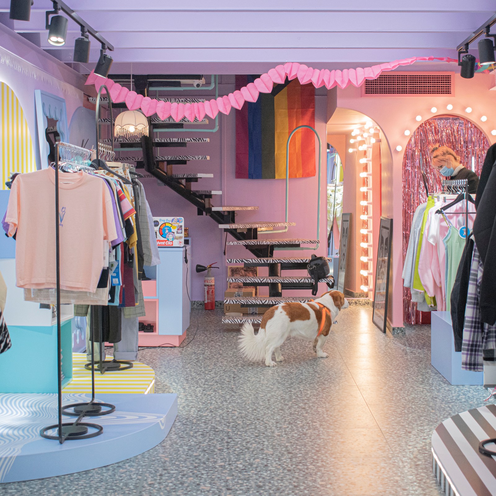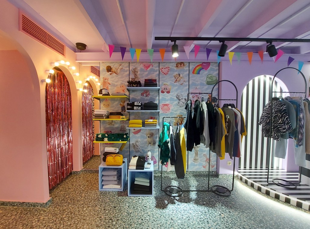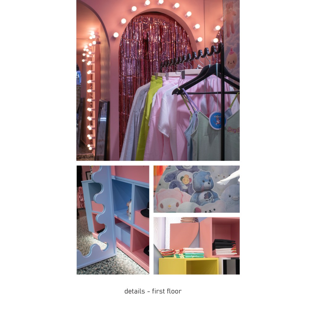 “Cupid” is a multi-use architectural project born in the era of a global pandemic, designed and crafted to accommodate clothing boutique, photography studio, party place, mini fashion show room, or anything the users of the space wish to. The chaotic nature of internet culture of memes, old school colorful anime, 90’s and 00’s aesthetic revival, post-modernism, glitches and errors, Gio Ponti’s ceiling patterns, new-old mosaic floors, and fluffy animals squished in toy machines have been huge design and curatorial influences, letting Cupid be many things at once but always instagrammable and multi functional as a physical and digital apparel store. Born in the era of quarantines, the need of stores to be multi functional and easily transformable started to rise rapidly, one-line shopping being a factor that had to be considered right from the start. This project, since it’s opening, therefore, is practically built anew every few days, from pieces of furniture designed and custom made to be stacked and re-ordered around, like platforms, boxes, Tetris blocks, background patterns, all in a color pallette showing prominently in both floors of the store, that allows this re-or ganisation to be possible and aesthetically pleasing without the presence of an architect- and thus making the user an architect.