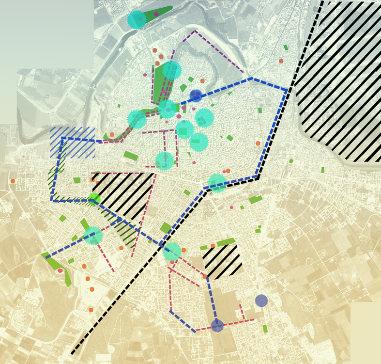 - το τόξο της τάφρου του Χατζηχαλάρ που φτάνει μέχρι τον Πηνειό (μίξη δραστηριοτήτων: εύνοια σε τροχιές, θεματικοί κήποι, κοινοτικοί μπαξέδες, άνοιγμα των προαυλίων των σχολείων προς τους δημόσιους χώρους.)